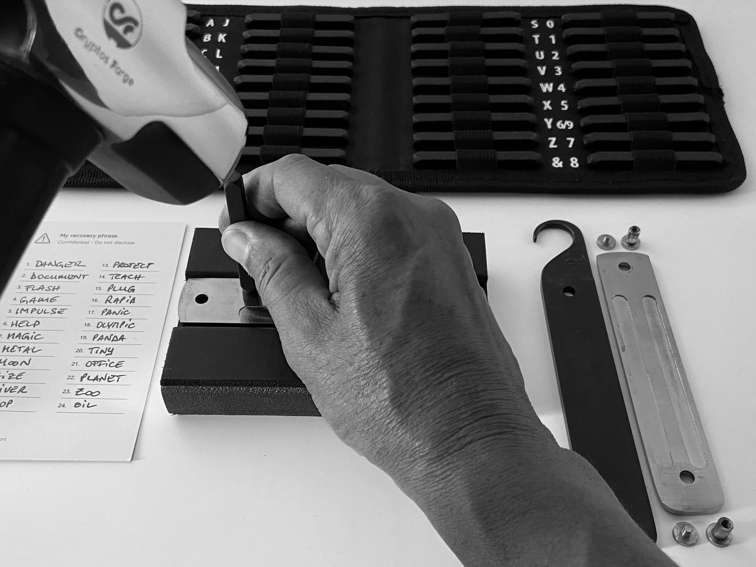 Inspiré d’un manche de couteau, ce dispositif est dédié à l’investisseur qui a décidé de conserver définitivement 1 portefeuille à 24 mots ou 2 portefeuilles à 12 mots secrets dans des platines (amovibles) en titane ; le métal le plus solide qui soit, assemblées sur un support forgé main en acier carbone trempé d’une extrême robustesse et orné d’un crochet en forme de col de cygne