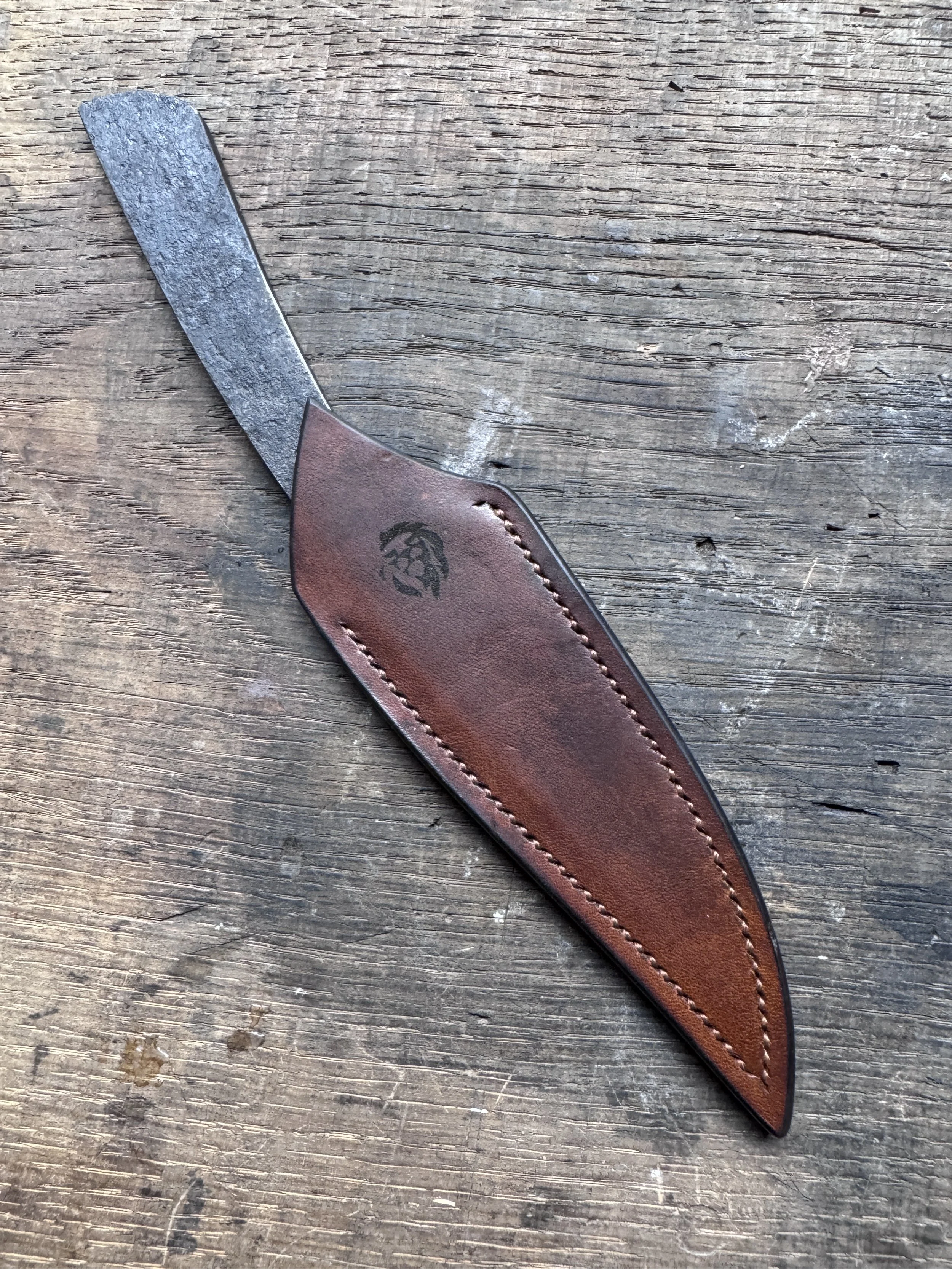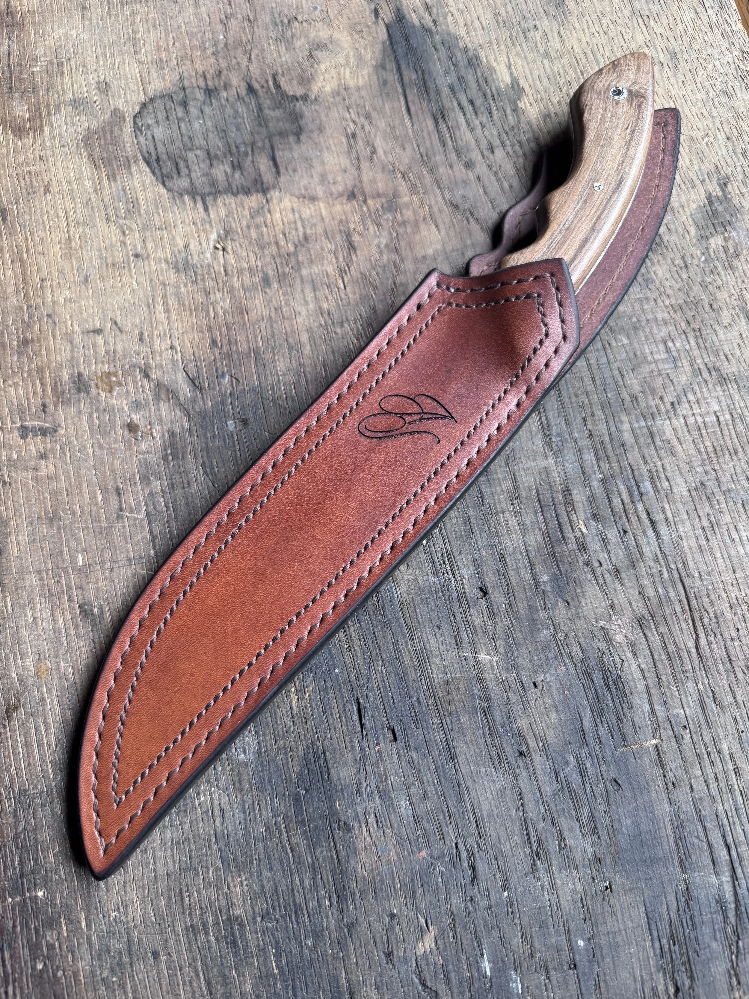 L’étui que nous avons gravé d’une fleur de lys est en cuir de collet de bovin tanné végétal naturel que Sébastien a teinté couleur “nubuck” et cousu à la main en point sellier avec un fil plat ciré anglais assorti avec le bois de manche et équipé d’une pince à billets riveté dans la masse pour un port facile à la ceinture ou en poche.