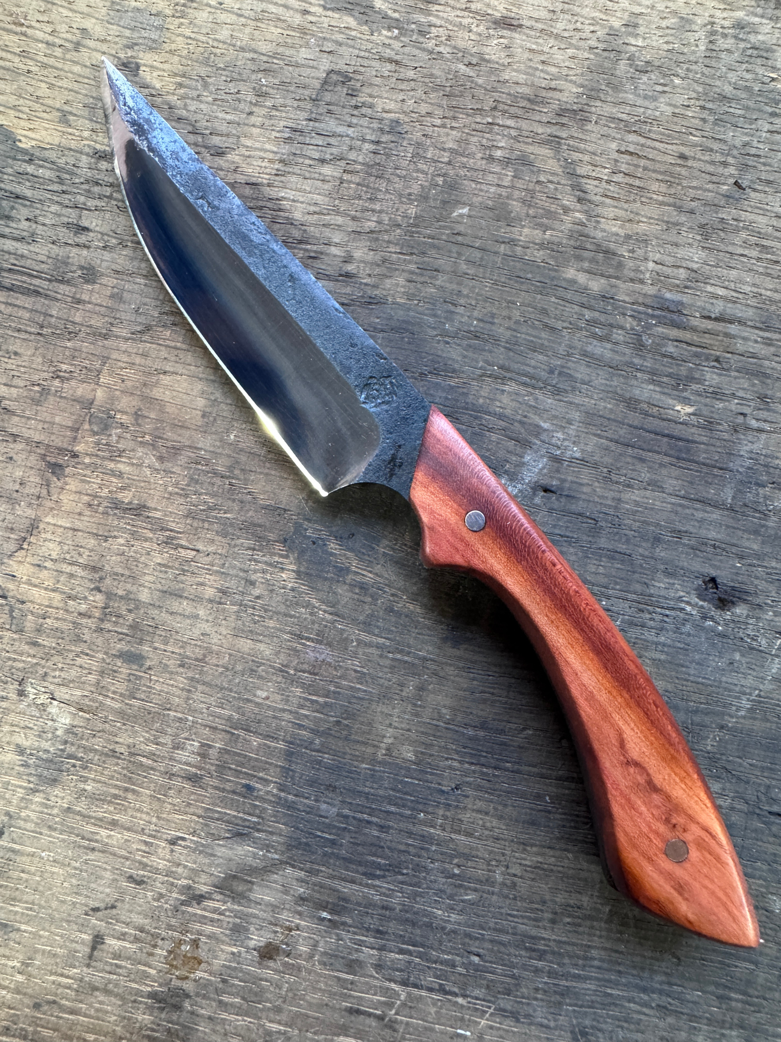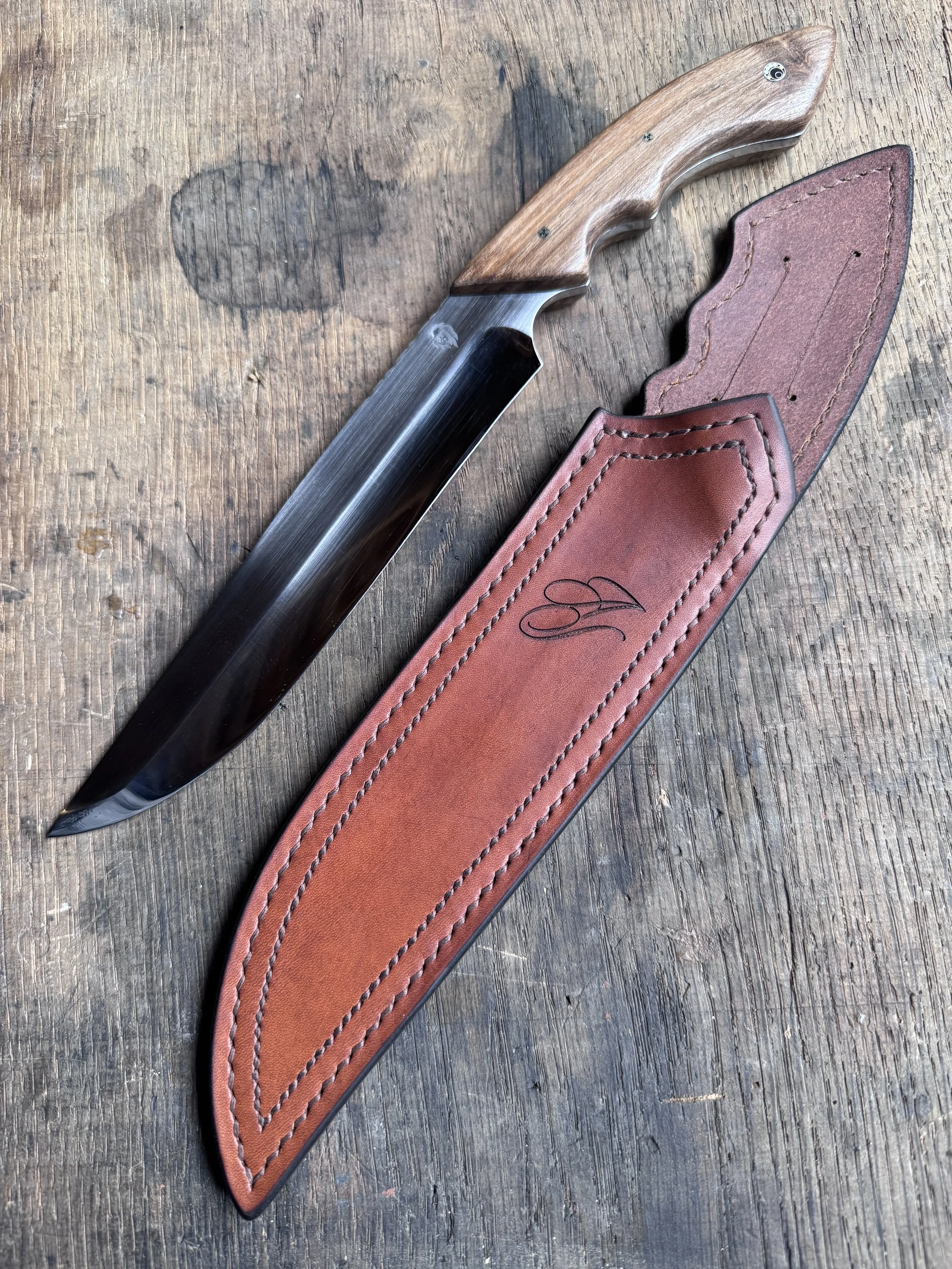Le couteau de Sébastien est en acier carbone de haute qualité trempé en “brut de forge” de forme “point de fuite” poinçonné de ses initiales, avec un manche en Noyer que nous avons raboté, coupé, calibré puis assemblé avec de magnifiques rivets mosaïques et lustré avec notre encaustique “maison”.